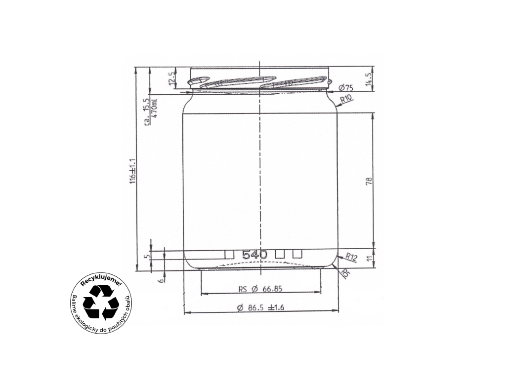 Praktická šroubovací zavařovací čirá sklenice VÁLEC o plnícím objemu 510 ml je určená pro víčko Twist Off 82. Sklenici je možno opatřit etiketou až do výšky 85 mm.